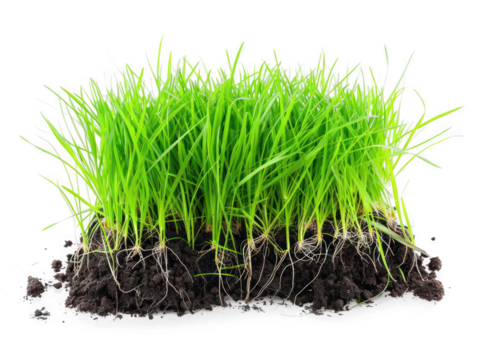 Young green grass sprouts emerging from transparent soil with visible roots on transparent background
