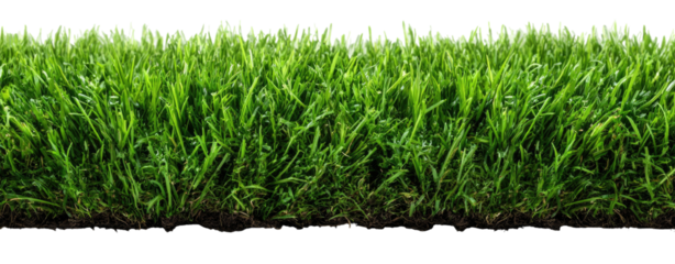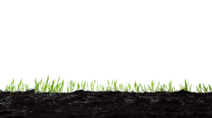 Close-up of young green grass sprouts emerging from dark soil on transparent background
