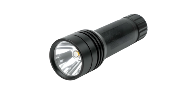 Black metal flashlight illuminates brightly on a dark background