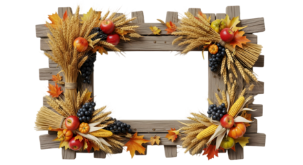 Autumn Harvest Frame: A rustic wooden frame adorned with autumnal elements, including ripe apples, wheat stalks, grapes, and corn, creating a decorative emblem of the season.