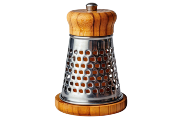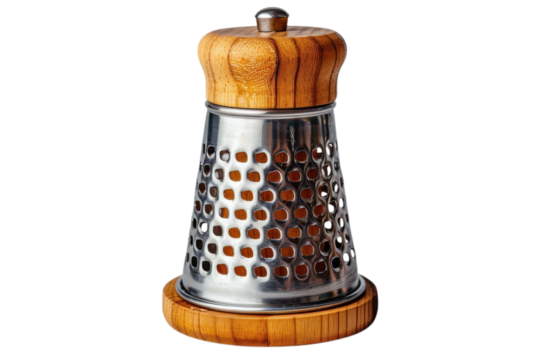 Stainless steel grater with wooden accents for kitchen use and food preparation on transparent background