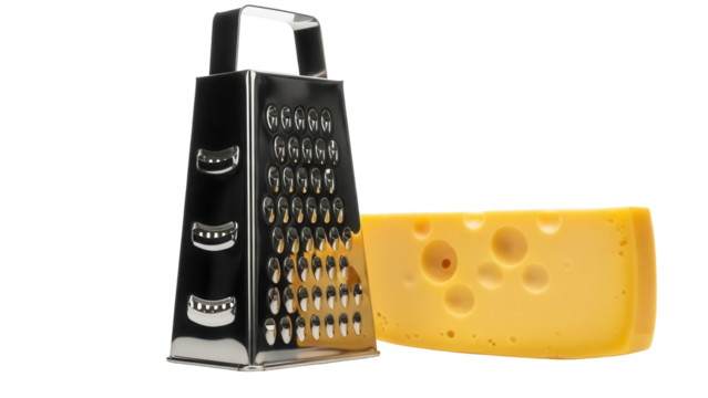 Swiss cheese block and grater isolated PNG, dairy product with holes on transparent background for cooking and food preparation