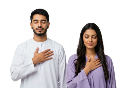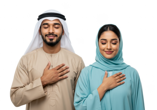 Thank You. Grateful Young Arab Man And Woman With Eyes Closed Keeping Both Hands On Chest, Thankful Middle Eastern Couple Expressing Grattitude White background