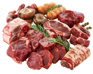 A variety of raw meats and mushrooms arranged  Isolated on transparent background.
