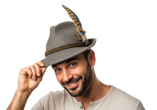 PNG cut out isolated background. A close-up portrait of a handsome and happy mature man with a grey beard, smiling while tipping his traditional green Bavarian hat in a friendly greeting.