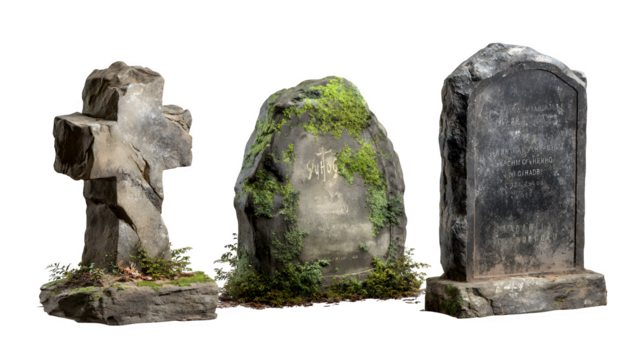 Weathered gray stone tombstone with cross isolated PNG, religious monument for cemetery or memorial, spiritual symbol on transparent background