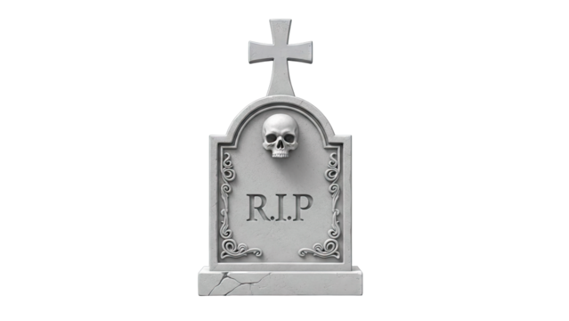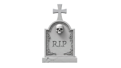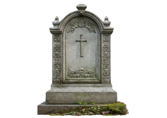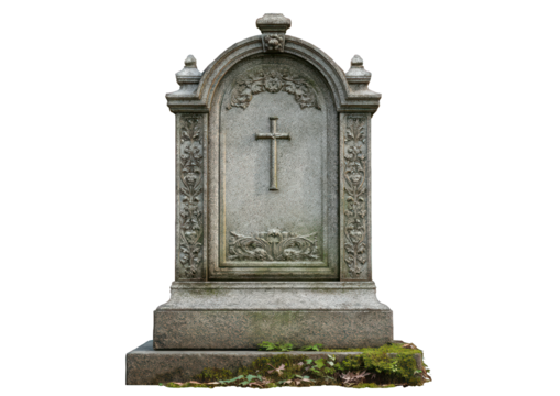 Elegantly weathered stone tombstone with a cross on black background, graveyard