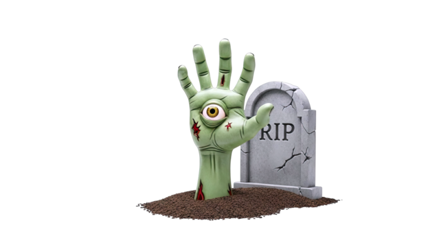 Cartoon-style illustration of an old weathered gravestone on a rocky base with a bare tree.