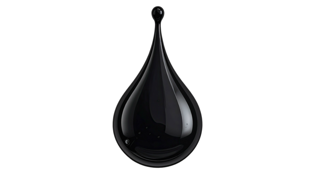 A photorealistic, glossy black liquid drop suspended against a stark, black background