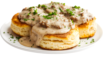 Delicious Biscuits and Sausage Gravy Isolated on White Background for Cooking Blogs and Menus