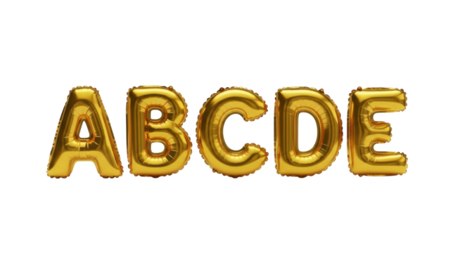five shiny metallic gold foil letter balloons (a, b, c, d, e) arranged horizontally on a transparent surface, set against an isolated transparent background. concept for luxury celebration branding