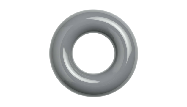 Rendered, glossy, grey, inflatable ring floating against a black background