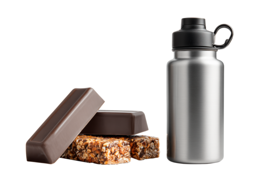A stainless steel water bottle sits next to granola energy bars and dark chocolate pieces on a transparent background.