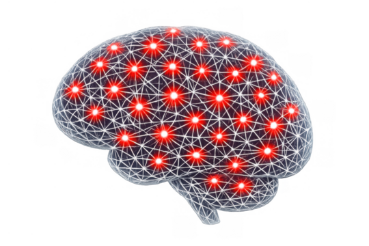 Artificial intelligence brain network with glowing red nodes, representing digital neural connections and data processing on transparent background