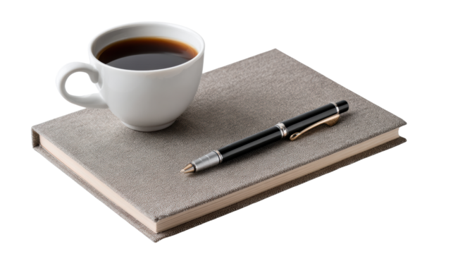 Coffee cup, pen, and notebook on a gray surface, perfect for relaxation or productivity moments.