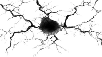 Close up of a neuron cell body with branching dendrites and synapses on png isolated transparent background black background