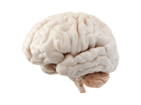 Human brain model showcasing complex anatomy, intelligence, learning, and neuroscience research on transparent background