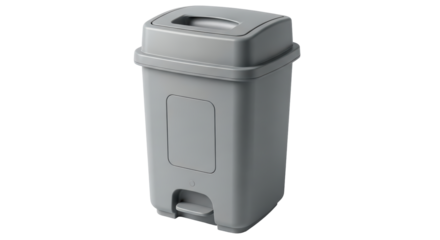 Studio shot of a dark grey plastic wheeled trash can with attached lid, isolated on transparent background