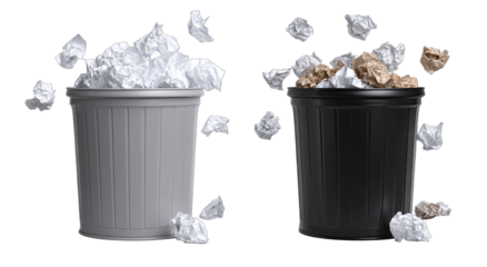 Two overflowing trash bins, one white, one black, with crumpled paper