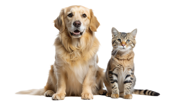 Adorable cat and dog surrounded by autumn leaves on transparent background
