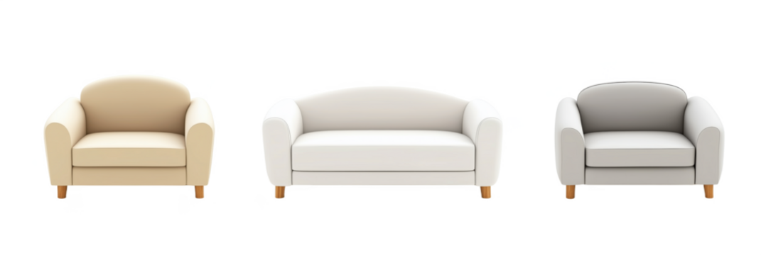Modern minimalist armchairs in beige, white, and gray colors with wooden legs, isolated on transparent background, png