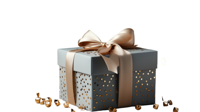A stylish gray gift box with scattered confetti, ideal for elegant gifting, isolated on transparent background.