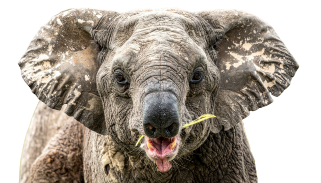 African elephant isolated on transparent background, large wild animal, wildlife conservation, safari mammal, detailed texture, front view, realistic cutout for design and print
