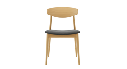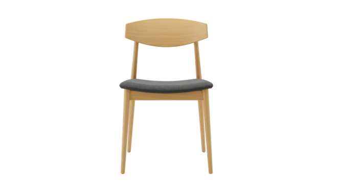 Modern light wood chair with gray fabric seat isolated on white, minimalist furniture for dining room or kitchen PNG