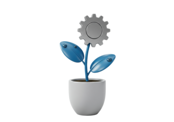Isolated flower in a pot with gray gear head, blue leaves, and dew drops looking futuristic
