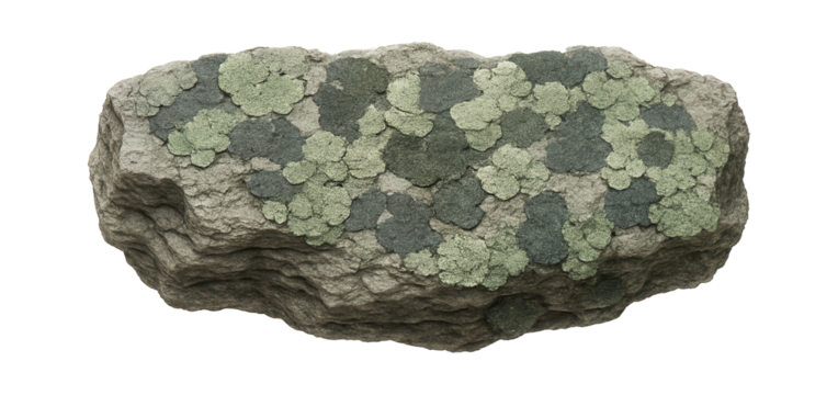 Lichen-covered rock fragment displaying a patchwork of gray and green hues