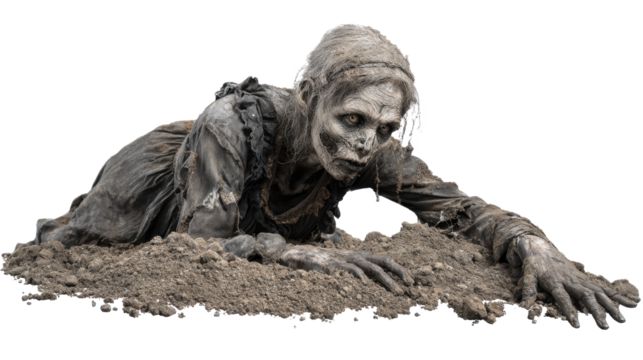 Undead female zombie with pale decaying skin and gray hair clawing out of a grave, crawling from the earth in a grisly, frightening resurrection of the walking dead