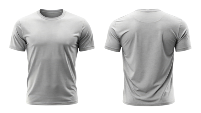 Two gray t-shirts on display, front and back views, cut out transparent