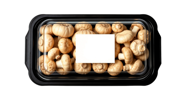 Black plastic tray containing fresh mushrooms and blank label mockup packaging isolated on transparent background