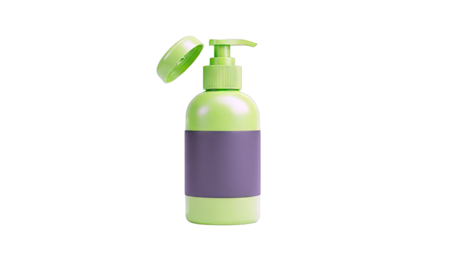 Green pump bottle with open cap and gray label