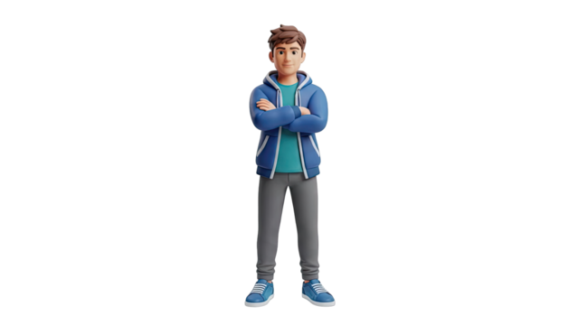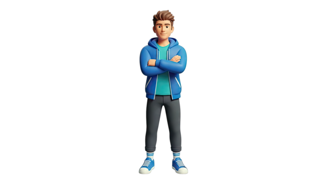 3D cartoon boy in blue hoodie and gray pants
