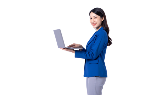 Young woman in blue blazer and gray pants holding a laptop and smiling at the viewer, white background