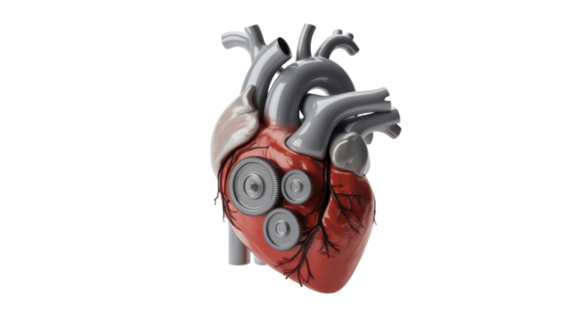 A 3D render of a stylized human heart, featuring internal mechanical gears, symbolizing precision, health, or an artificial organ concept. background removed