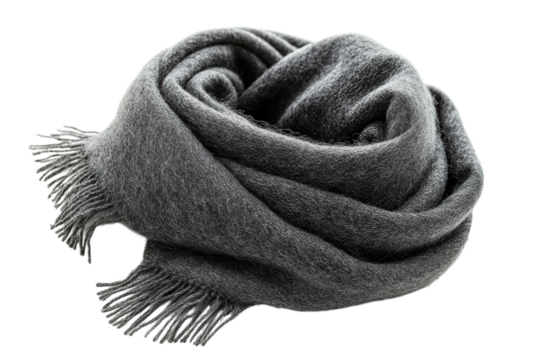 Collection of grey silk scarves arranged in various styles on a transparent background. Each scarf is displayed completely isolated, highlighting its texture and design.