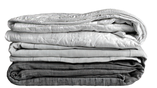 Neatly stacked cozy blankets in light and dark shades