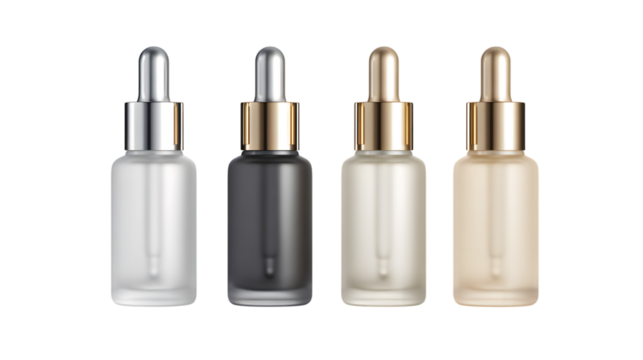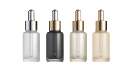 Four cosmetic dropper bottles in different shades isolated on a transparent background