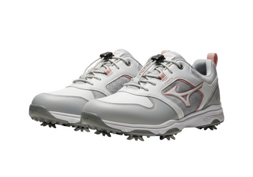 A pair of white and gray golf shoes isolated on transparent background, designed for comfort and performance on the course, featuring advanced traction technology