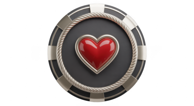 Red heart on a gray and silver poker chip gray background isolated on a transparent background
