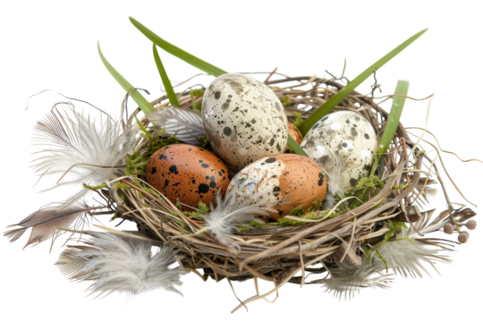 A delicate nest filled with speckled eggs surrounded by green grass and soft feathers in springtime