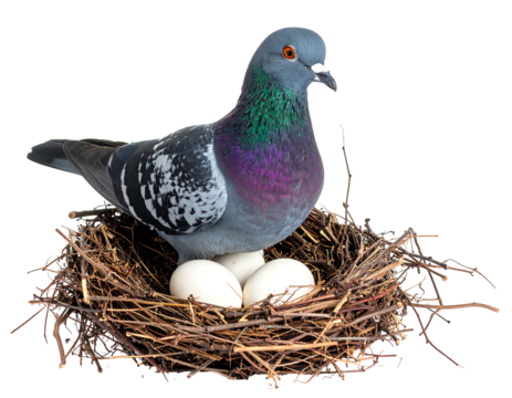 A close-up view of a pigeon in a nest, surrounded by eggs against a transparent background