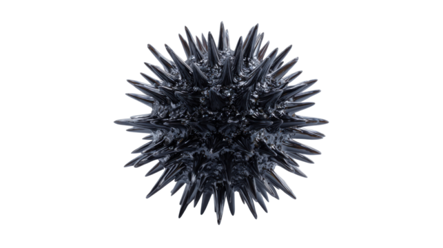 Virus or bacteria microorganism made of dark gray chrome material with sharp spikes on a transparent background