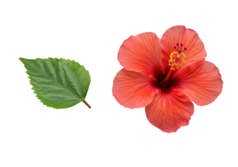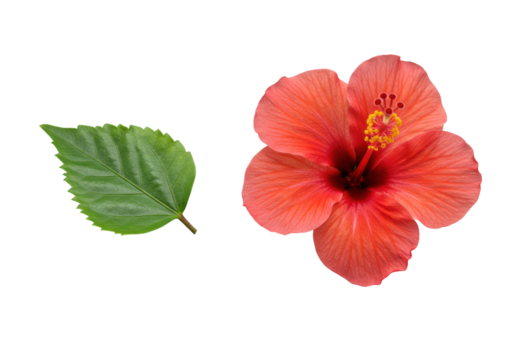 A vibrant red tropical hibiscus flower with yellow stamen and lush green leaf, perfectly lit in a clean studio on a neutral gray background from 45 degrees, botanical elegance and precision