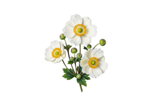 high-fidelity watercolor illustration of delicate white japanese anemone flowers with yellow centers and green buds against a pale transparent studio background, no shadows, botanical art concept of