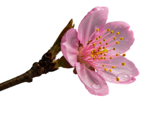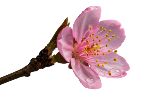 Vibrant pink cherry blossom branch with dewy petals, golden pollen, snapped stem, transparent background, ultra-detailed macro, hard light, deep shadows. Concept of precise botanical beauty