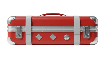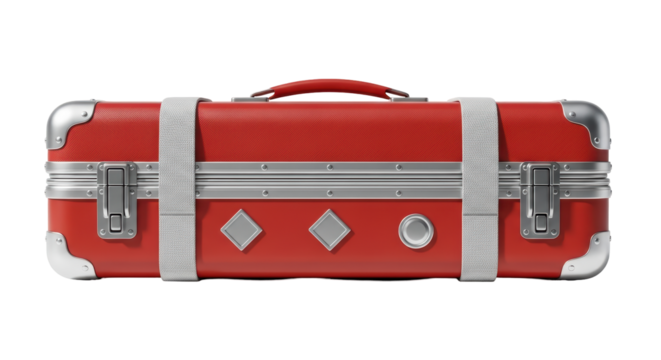 Isolated red suitcase with leather handle and chrome trim, secured with gray straps for travel