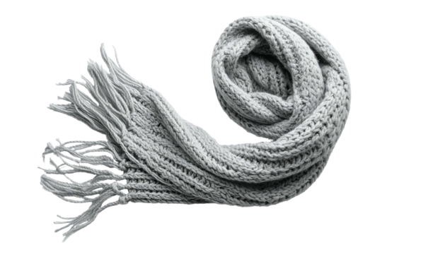 Close-up of a cozy, gray knit scarf, with thick weave and long tassels